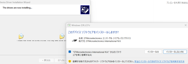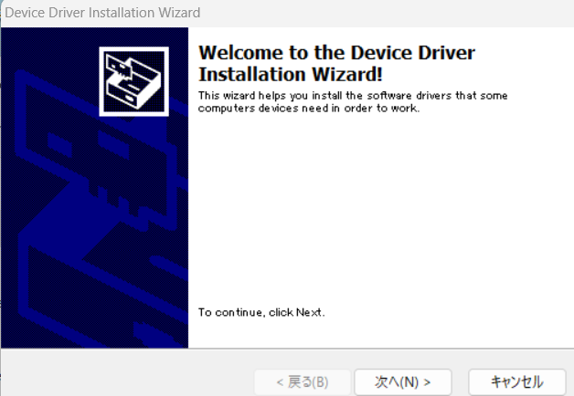 インストールが始まった後、デバイスドライバーインストールのウィンドウが開くので、【次へ】をクリックする。